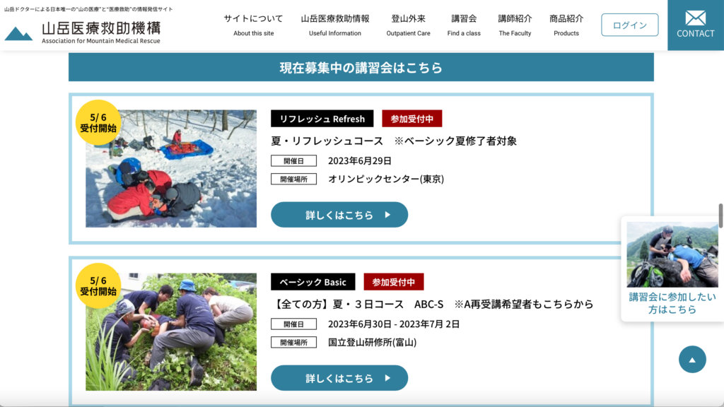 山岳医療救助機構(代表大城和恵、東京)にて山岳医療に関する講習会の募集がなされております(詳細はこちらから)